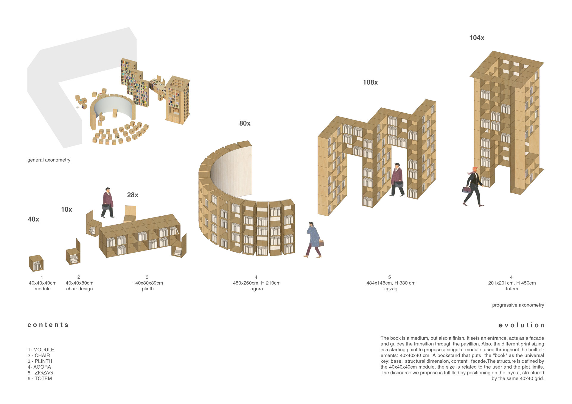 3. Key element: The book is a medium, but also a finish. It sets an entrance, acts as a facade and guides the transition through the pavillion. Also, the different print sizing is a starting point to propose a singular module, used throughout the built elements: 40x40x40 cm. A bookstand that puts the "book" as the universal key: base, structural dimension, content, facade.