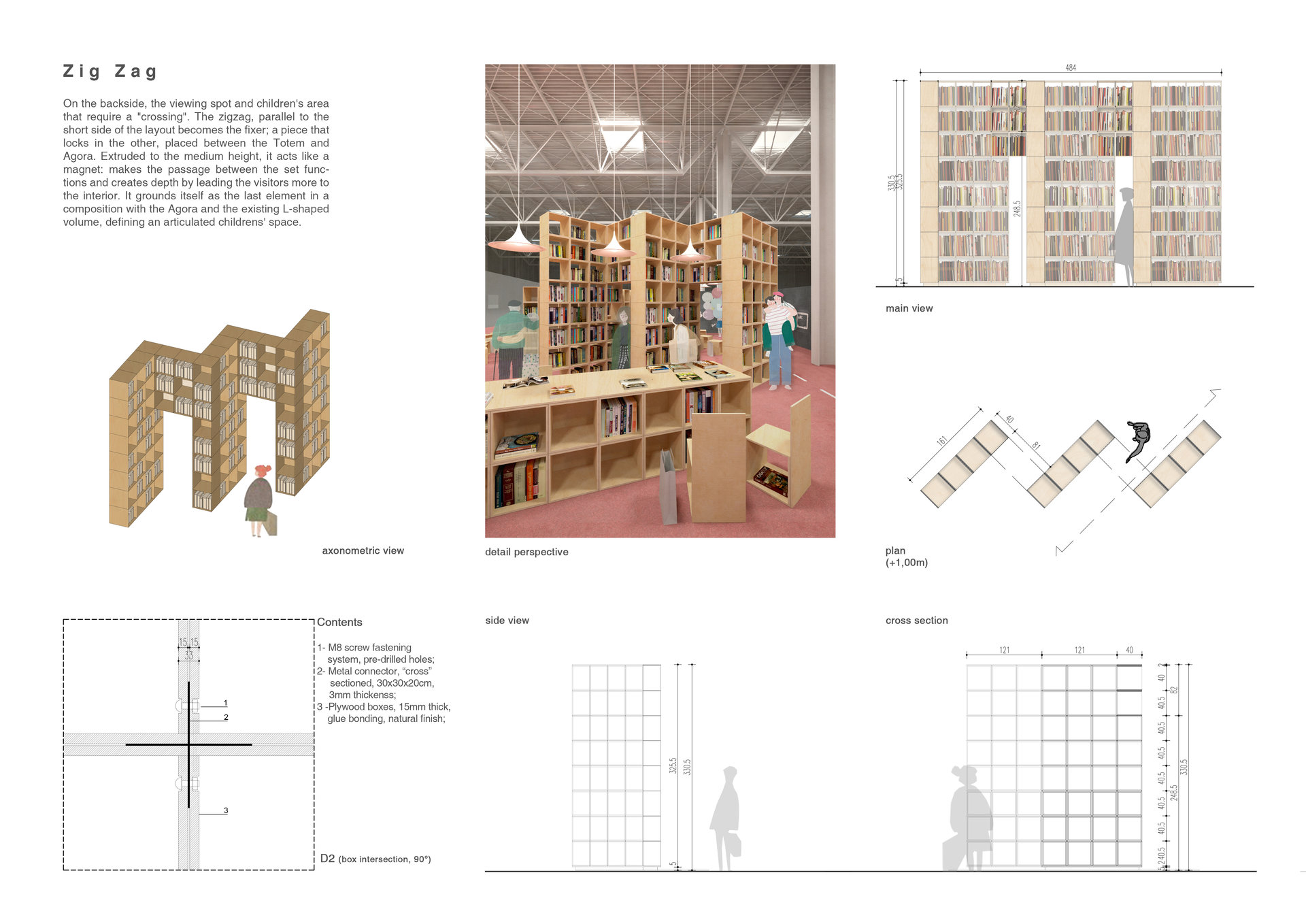 By now, we've established a strong frontline of content and context: information, debate, bookshop represented by different height volumes and expressed in 40x40x40 modules. The visitor can enter, walk around, take part and most important become part ‘of’. Lastly, on the backside, the viewing spot and children's area that require a "crossing". The zigzag, parallel to the short side of the layout becomes the fixer; a piece that locks in the other, placed between the Totem and Agora. Extruded to the medium height, it acts like a magnet: makes the passage between the set functions and creates depth by leading the visitors more to the interior. It grounds itself as the last element in a composition with the Agora and the existing L-shaped volume, defining an articulated childrens' space.