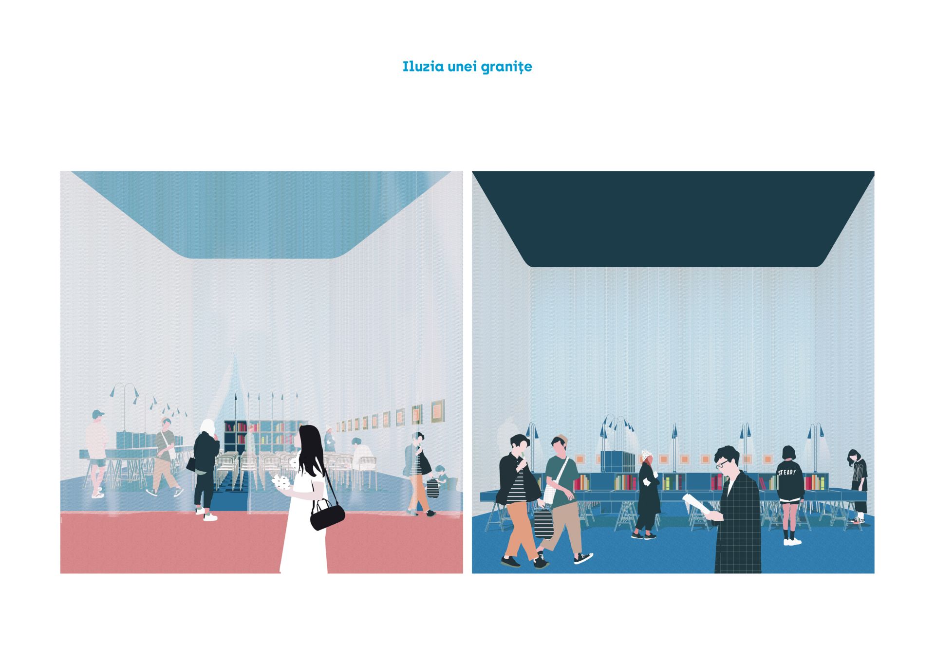 CONCEPT. Propunerea pune în discuție realitatea delimitării, a „tragerii cortinei”, acum, la sfârșitul unei etape istorice pentru Marea Britanie, și își propune să transforme trecerea „graniței” într-o experiență senzorială. Printr-un gest ferm dar blând, standul va fi înconjurat și marcat de o draperie textilă semitransparentă, cu o lungime de 7m, suspendată, pe conturul standului. Limita devine astfel prezentă deși diafană. Materializarea limitei transformă trecerea ei într-un gest fizic cu valoare simbolică. Intrarea în perimetrul standului se va face prin „darea la o parte” a țesăturii suspendate. Deși marcat de „iluzia” delimitării, standul britanic devine un loc al incluziunii, un spaţiu liber şi sigur, un spațiu flexibil, capabil să ofere experiențe multiple vizitatorilor lui.