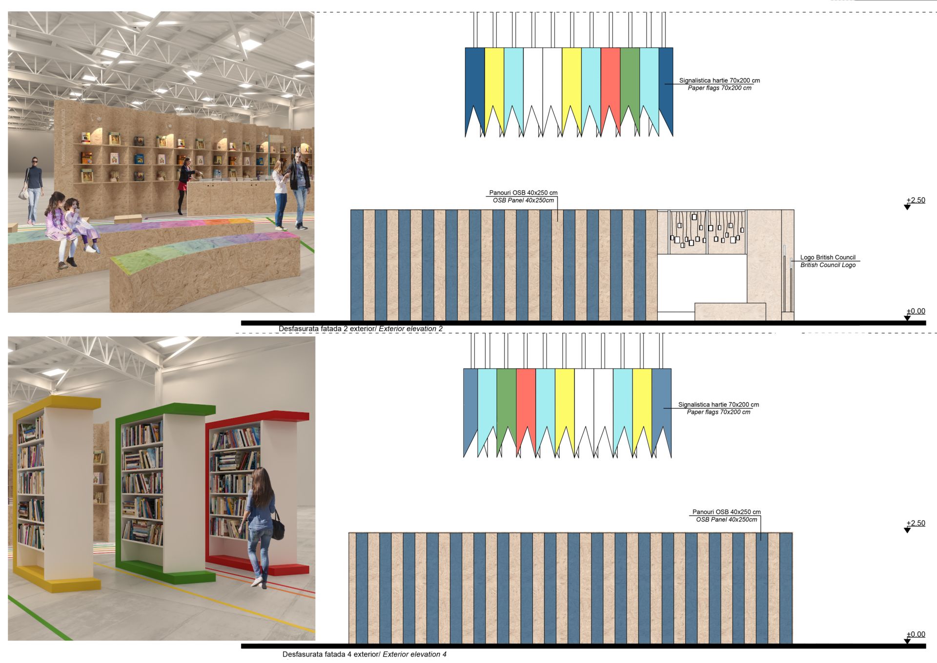 To summarize all the above, we designed a space entirely dedicated to the presentation of the books, divided to allow multiple activities simultaneously but which can function as well as a whole, made of recycled modular and environmentally friendly materials, with a couple of colored touches to better highlight the major areas and guide you through the entire space, gain awareness and reflect the idea of an opened to everyone multicultural territory, barrier free from any kind of constrains and assumptions.