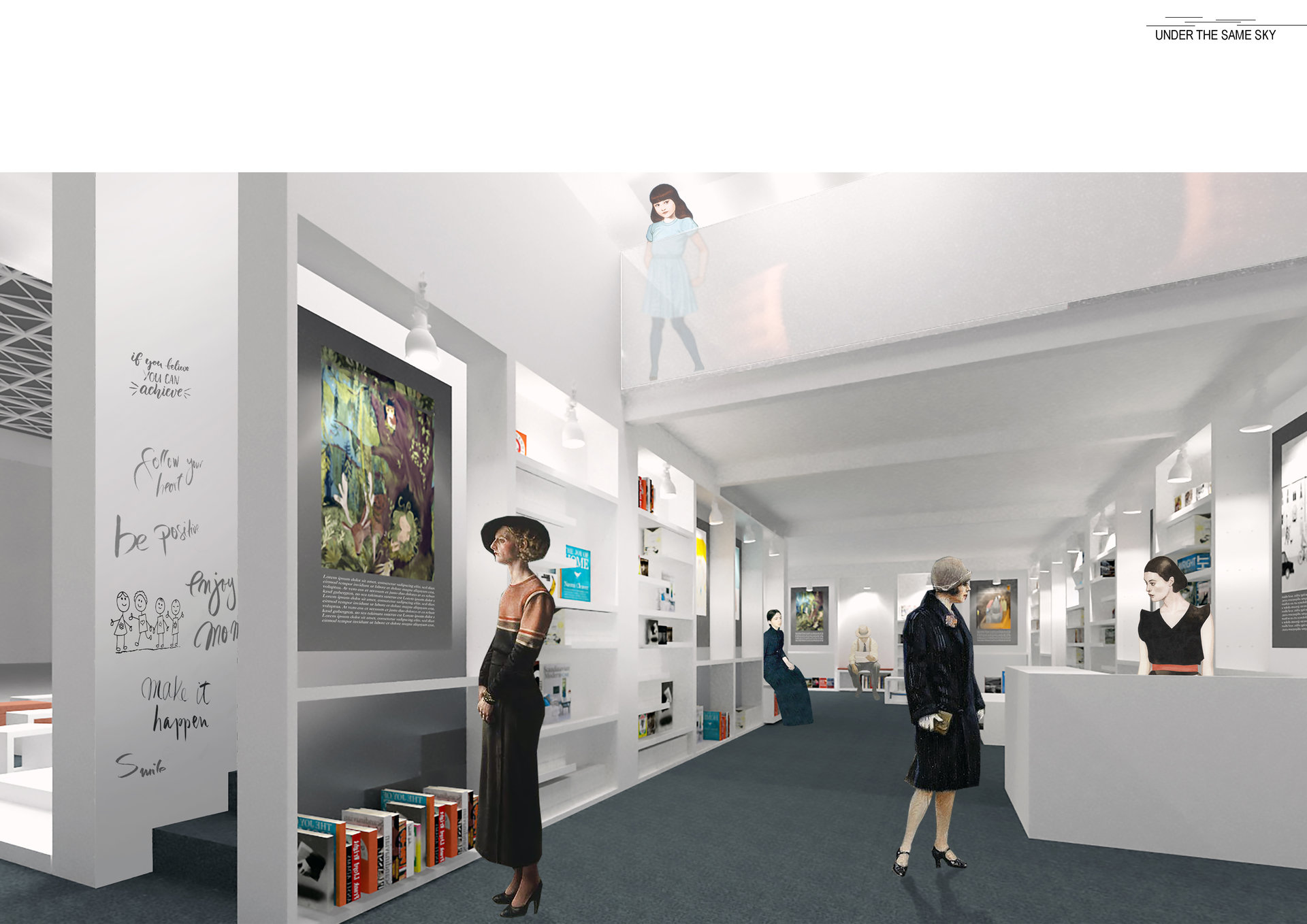 The children's area is situated upstairs to create a secure and creative space, with an exciting view of the fair. Metaphorically, children represent the future; they are looking to the future, with a knowledge foundation, so they are the ones who will know how to cross the boundaries and reach up.