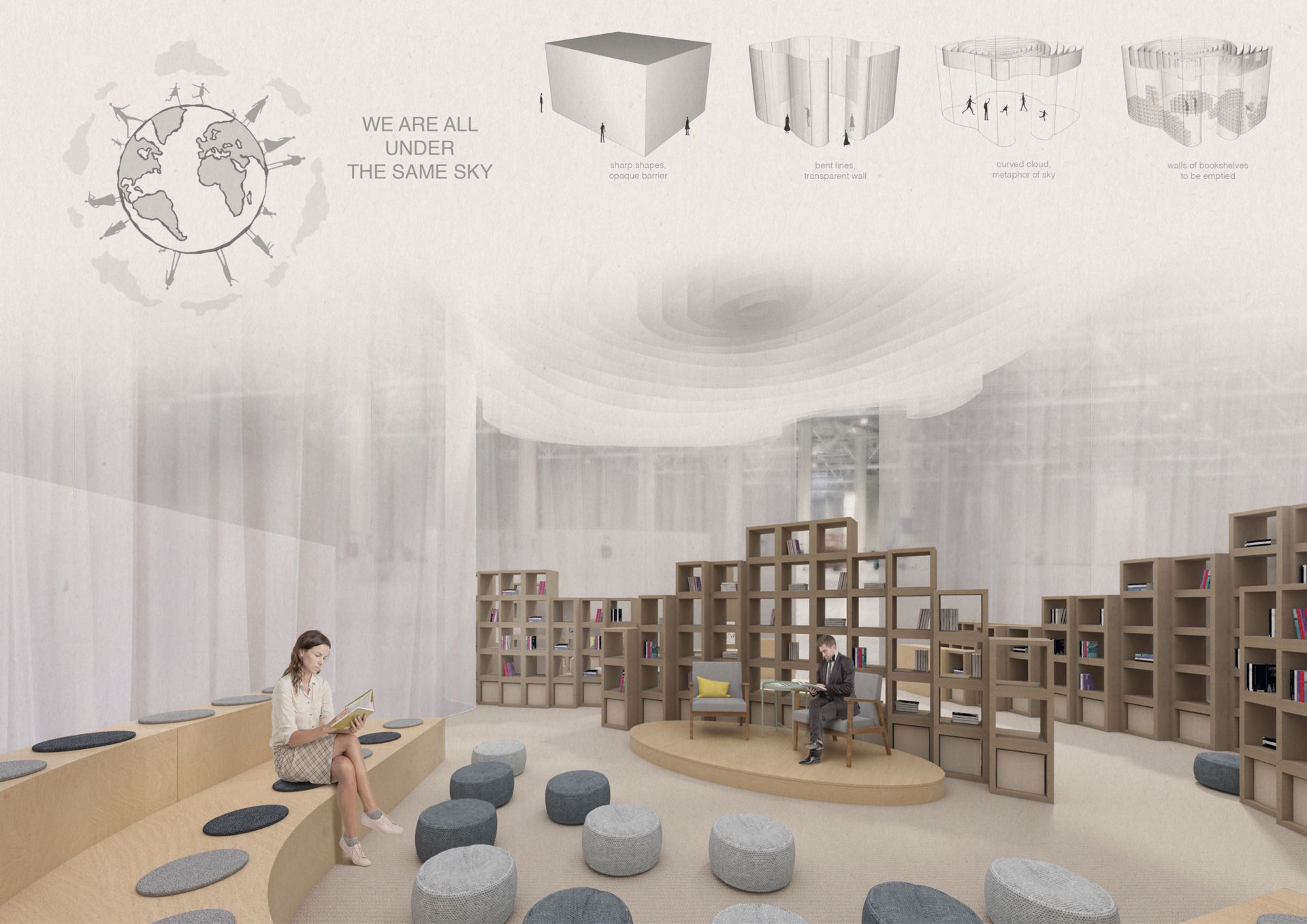 Our idea for this pavilion is a series of metaphors that materialize through shape, texture and light. The barrier is there, but its sharpness is softened by the use of a curved, transparent curtain, to let you know that something is happening, but you have to actually come closer and closer to discover and understand. Once you are inside the pavilion, you feel like entering an ethereal, idealistic world, where a cloud made of curtains and washed by light dominates the entire space, like a metaphor of inclusiveness, of people being equal, all under the same sky.